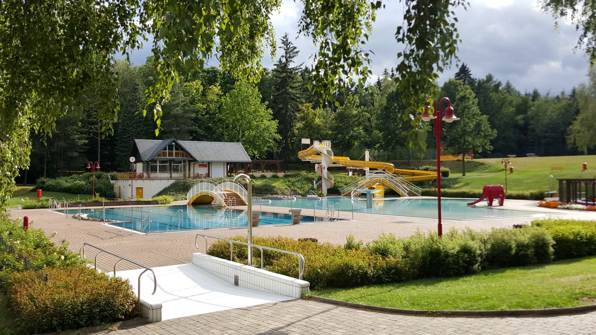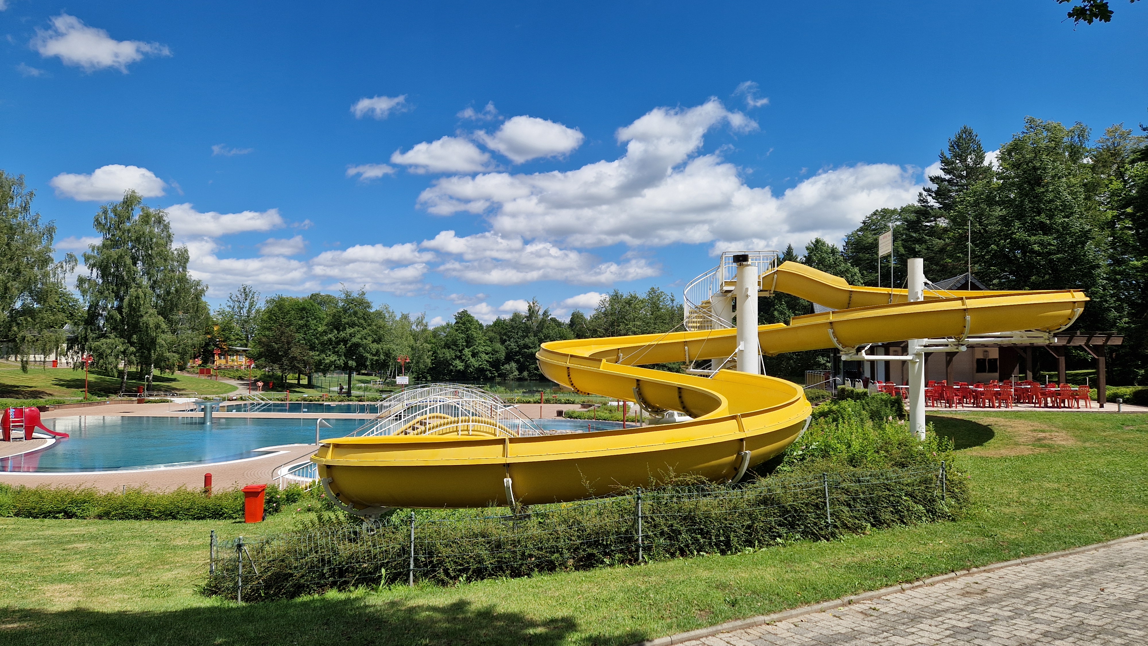 Das Solar-und Fernwärme beheizte Erlebnisbad Olbersdorf bietet Sommerbadespaß für die ganze Familie. Tauchen Sie ein in das klare Gebirgswasser mit seinen 21°C – 23°C. Ganz egal, ob Sie Ihre Bahnen im 25 m Sportschwimmbecken ziehen, rasant die 72 m lange Rutsche heruntergleiten oder sich im 800 m² großen Erlebnisbecken wohlfühlen: Entspannung und Erholung sind Ihnen garantiert. Und das nicht nur im Wasser! Auf den großen Liegewiesen stehen ausreichend Sonnen- und Schattenplätze zum Relaxen bereit. Für Abwechslung sorgen die beiden Kinderspielplätze und diverse Sportgeräte, die zur aktiven Erholung einladen. Kulinarisch verwöhnen Sie ein Restaurant, eine Cafeteria sowie ein Imbiss-Kiosk auf unserem Freibadgelände.
