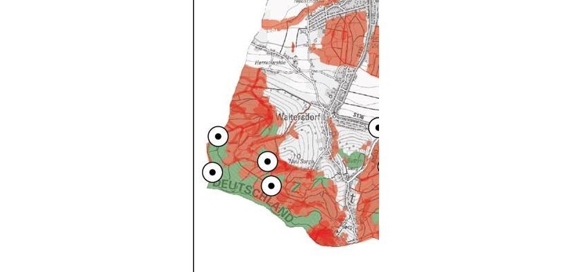 Zuerst wird das Gebiet westlich von Waltersdorf bis zur Tschechischen Grenze beflogen.