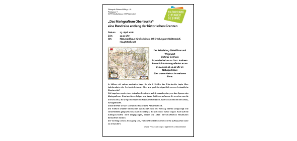 Wir begeben uns in einer virtuellen Rundreise auf Grenzexkursion, um den Spuren des Markgraftums Oberlausitz zu folgen und deren Größe zu erfassen. Es werden uns die Grenzräume, die wir gemeinsam mit Preußen/ Schlesien, Sachsen und Böhmen hatten,